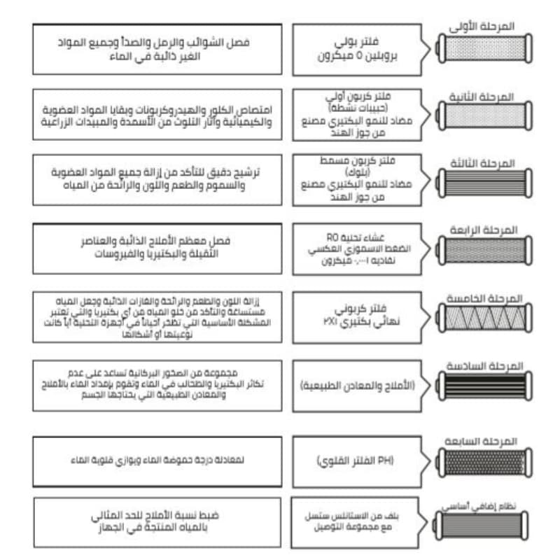 فلتر 7مراحل يعمل على تمرير المياه عبر مراحل متعددة ومدروسة وبطريقة متسلسلة تراعي الترتيب الذي يجب أن تجري فيه من تصفية وتنقية وتعقيم و تعديل الطعم حيث تمر المياه بمراحل تزال فيها الشوائب والأتربة وتلك الجزيئات الضخمة ومن ثم سوف تمر بمراحل نانو تخص تعقيم المياه ونقصد هنا تعقيمه من العوامل الممرضة وبشكل رئيسي الفيروسات والميكروبات والتي تعد أكثر التهديدات التي يمكن أن يتعرض لها الإنسان عبر مصادر المياه المتلوثة والتي تضمن إعطائنا أفضل المياه الصالحة للشرب / بتقنية فيتنامية